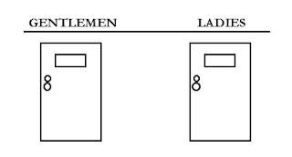 This is Lacan’s illustration of “urinary segregation” (Lacan 2002, p.143). Lacan’s anecdotal graphic demonstrates how “the signifier in fact enters the signified” (2002, p.142). His aim here is to show how the signifier becomes materialised in reality. His example is based on the traditional “faulty illustration” (ibid.) but here he uses associated binary terms. Lacan explains that from the train windows the children in his story experience a different physical perspective due to their seating arrangement: the boy believes they have arrived at “ladies” and the girl at “gentlemen” (2002, p.143). So, what in fact is happening for Lacan is that the railway lines represent and actualise the bar in Saussure’s model, becoming “a barrier resisting signification” (Lacan 2002, p141). Thus, the real signifier here (the toilet doors) creates for the children an ideological binarity positioning them in opposing domains (Lacan 2002, p.144).